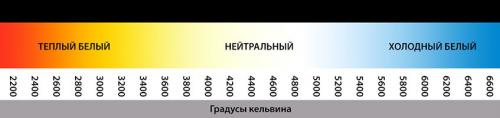 - нейтральный – от 3500 до 5000 К. Чистый белый цвет, не раздражающий глаза;