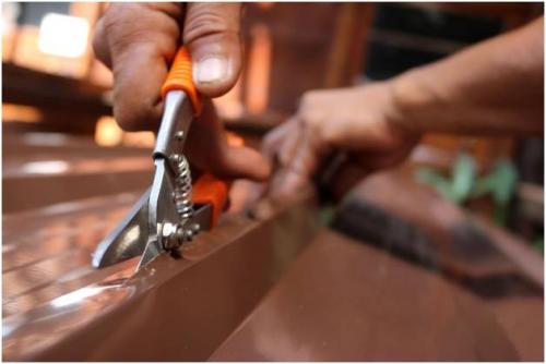 Ручными ножницами разрезать профнастил можно достаточно просто. При помощи такого инструмента достигается чистая линия реза. Кромки получаются без заусенцев.